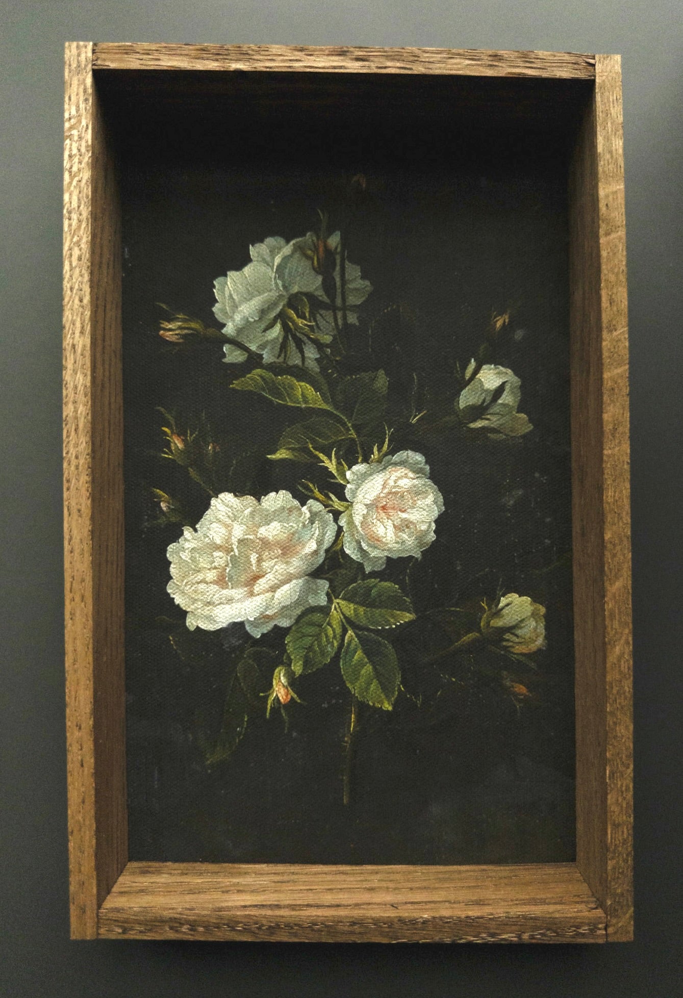 A romantic bloom preserved in stillness, Petals in Shadow features delicate white roses printed in high resolution giclée inks on fine art canvas. Mounted on wood and set in a handcrafted solid alder frame, each piece carries the quiet beauty of a vintage still life with a touch of rustic soul.
